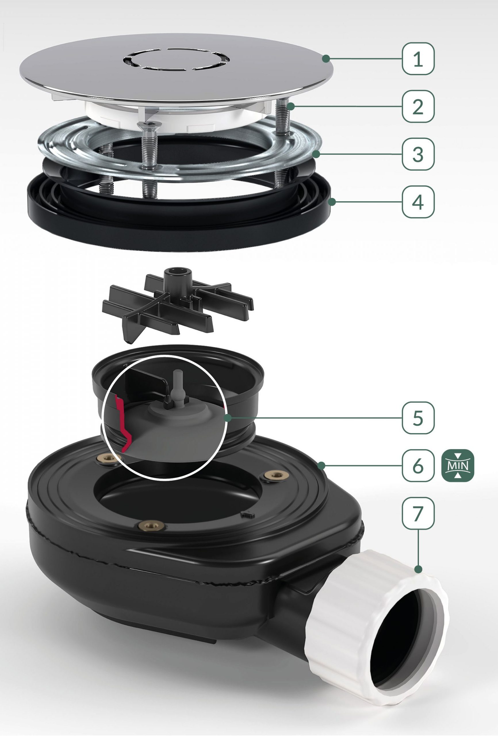 - Black PP waste body, engineered to minimise installation height to just 50 mm
